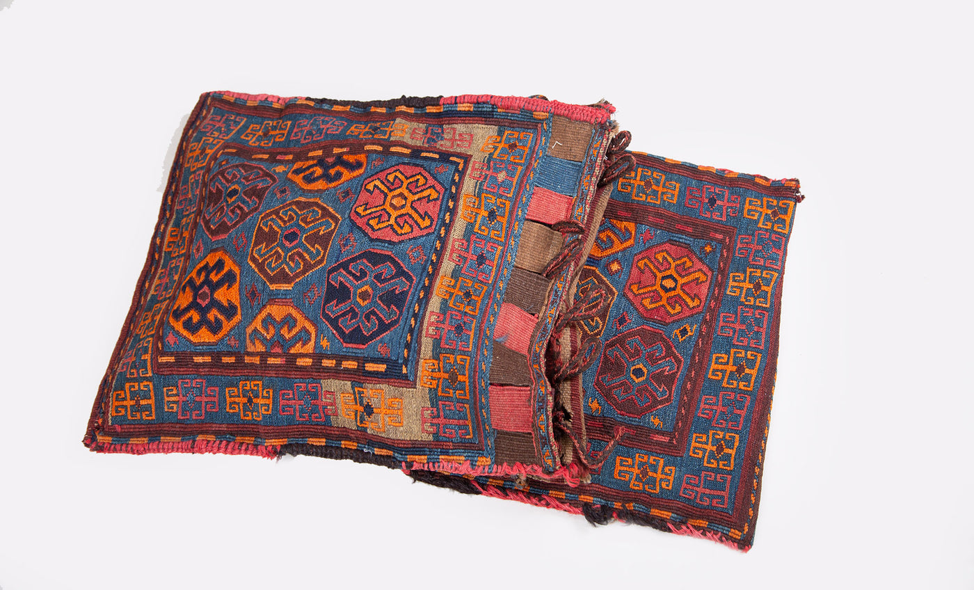 こちらは、遊牧民が馬やロバの背中に乗る時に利用する、鞍と袋を兼ね備えたサドルバッグとなります。移動中に物が飛び出ないように、袋の口に取り付けられている紐をフックのように閉じるようになっていて、よく考えられているなと感心します。地域や部族によってデザインが異なりますが、鮮やかな色彩が特徴的なクルド族のもので、欧米で大変人気のお品です。